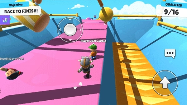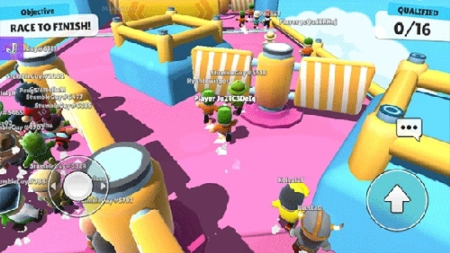 8、玩家需借助虚拟按键操控角色移动,右侧按键单击可实现“跳跃”动作,双击则触发“向前扑”;比赛设有三轮障碍赛道(地图),每轮结束后,成功抵达终点线或越过所有障碍的玩家将晋级下一轮,最终角逐出冠军……