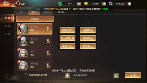在好友界面,能看到【好友】、【邮件】和【协助】这三大类功能。借助【好友】功能,我们可以查看最近联系或互动过的角色,也能浏览自己的好友列表,还能进行添加好友等操作;【邮件】功能主要用于领取系统奖励和拍卖行道具等;而【协助】功能则可以让我们看到帮派好友发布的各类协助信息。
