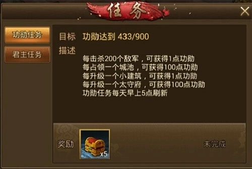 功勋任务是每天必须完成的任务,完成后可以获得大量的功勋宝箱,开启后后可随机获得招募令,银两和武魂。