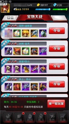在当前版本的《奥特曼系列OL》里,玩家等级提升到10级时,会通过剧情任务解锁“宝物争夺”系统。进入该系统后,玩家首先会碰到一些实力较弱的NPC,正好可以用来熟悉玩法,不过这些NPC掉落部件的概率比较低。之后,系统会刷新出与玩家等级、战力相近,且持有玩家所需部件的角色,大家可以通过抢夺的方式,从这些角色那里获取需要的法宝和变身器部件,进而合成完整的强力物品,增强自身的战斗力。