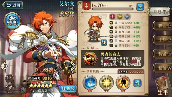 PS:二代大部分人物的羁绊手,光辉最好的超绝拥有者,强大的增伤和回血能力能让艾尔文单独面临一路敌人,高倍率的技能能对骑兵以外的敌人造成毁灭性伤害,新人必练。
