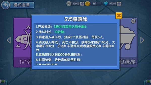 玩家组成5人队伍,分别在游戏中争夺水晶矿,优先获得一定数量水晶的一方,其装满水晶的矿车将会启动,慢慢开向己方矿洞。战斗以积分评判输赢,10分钟内,率先达到1000积分的队伍获胜。