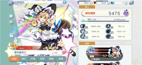 3、精致的人物画面带给你震撼的体验,你可以通过收集材料和道具提升人物的等级装备在不同的符卡上。