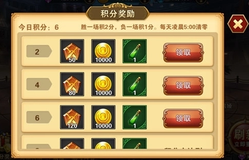 每胜利一场积2分,负一场积1分,积分在每天凌晨5:00清零。积分达到奖励领取条件后可以领取对应数量的古拉杜纪念章、金币及高级经验药水。
