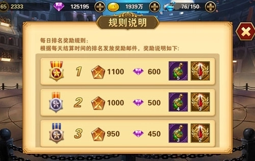 每天晚上21:00,系统将根据您当前的竞技场排名区间来发放相应的奖励,结算时的排名越靠前,获得的奖励也将越丰厚,赶紧来提升排名吧~