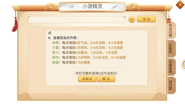 1每点敏捷可提升1.5点速度;每点体格对应8点气血、0.6点法防与0.2点速度的加成;每点力量能够增加1点物攻、0.4点法防和0.2点速度;每点耐性则会带来2.2点物防、0.4点法防及0.2点速度的提升。