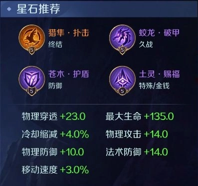 蓝绿星石首选物理攻击和物理穿透来配合穆桂英的2技能进行强力的爆发。紫色星石推荐蛟龙,苍木,土灵,保证和自身在团战中的持续作战能力的同时,也兼顾了爆发能力和更快的发育速度。