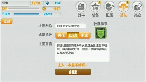 角色等级达到10级即可加入社团,角色等级达到29级即可创建社团,创建社团的费用是300水晶。1级社团人数上限为16人,每升1级加1人。