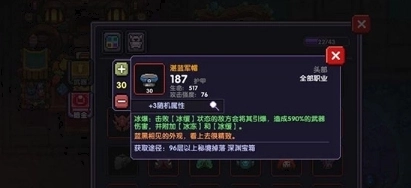 2、湛蓝军帽:这件头部装备也是96层以上秘境掉落的箱子才会开出来的,其特效是冰爆,击败冰缓状态的敌方是会将其引爆,造成590%的武器伤害,并附加冰冻和冰缓。