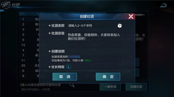 创建社团需要输入社团名称(社团名称会显示在角色头顶哦,记得起一个好听霸气的名字呢)和社团宗旨并且消耗1000钻石,当然花了这么多钻石创建了社团身为社长也是有特权可以享受的。