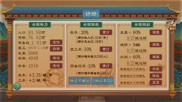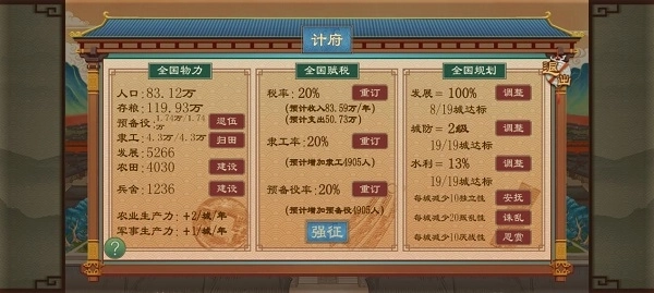 内政管理:包括宏观管理和地方治理,涉及税率调整、人口管理、城防建设等多个方面。