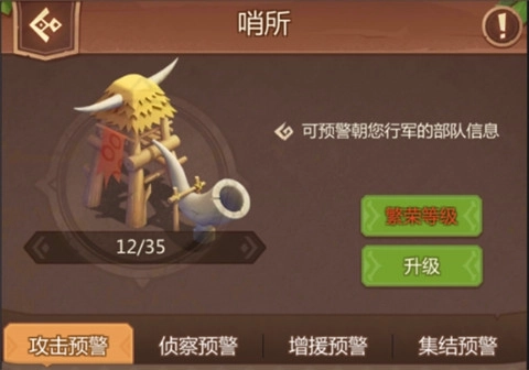 不想被打得措手不及?赶紧升级哨所。当你的领地受到攻击、侦查、运输或增援时,哨所会有情报警示你。越高级的哨所探索次数越多。
