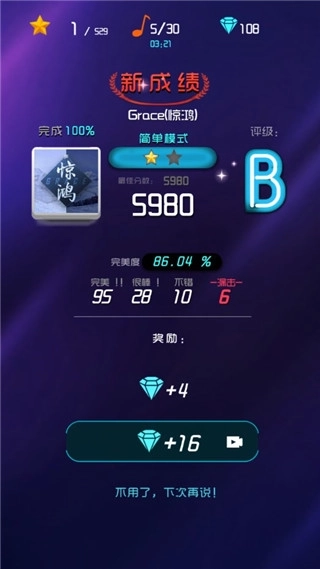 7、歌曲结束后游戏将进行结算,并会依据你的表现给予奖励。
