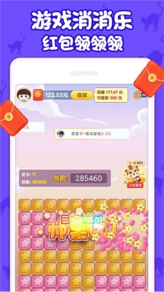 萌猫消消乐是一款非常好玩的竖版休闲消除小游戏。在这里玩家们可以通过消除的方式来帮助自己快速的通过游戏关卡,但是游戏的关卡拥有上千个,并且难度也越来越大,所以想要快速通关可是十分困难的,但是游戏了红包系统,所以只要玩家们不断的闯关就可以获得大量的红包,这些红包可都是可以进行提现的,因此有了萌猫消消乐,无论是杀时间,还是赚钱,都是挺不错的选择,因此喜欢的话,就来体验吧!