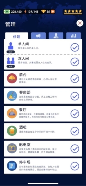 2、建筑升级攻略:优先把单人房里不耗电的建筑都升满,接着处理双人房的,之后再开始升级耗电的建筑。升级前先算好耗电量,根据情况适度提升电机等级来增加电量。再依据人流量,合理招募前台和客房服务员。这些都完成后,就可以建造餐馆并招募厨师,同时要一直保持电量充足。之后建造酒吧,最后完善停车场的车位和基础设施,提高员工的工作效率,剩下还没升级的建筑再逐一升级就大功告成啦。