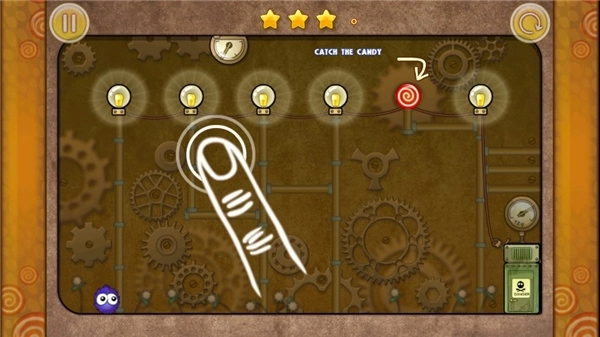1、在抓住糖果游戏里,玩家得依据关卡的地形与环境,协助小怪物获取它喜欢的糖果。