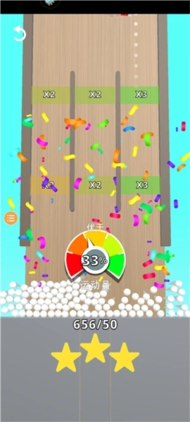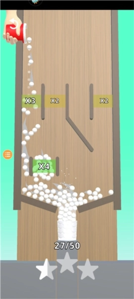 2、游戏操作十分简单,毫无难度可言。玩家只需点击屏幕,让小球移动到指定通道即可。小球在遵循物理规律下落的过程中,会自动经过翻倍杠杆,由此生成大量弹跳球。玩家要做的就是通过杯子接住这些小球,进而完成关卡。