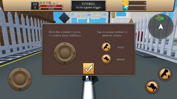 3、创建完成后再次点击“play”按钮就能进入游戏,游戏中我们用左侧摇杆控制角色移动,右侧的按钮则用来操控小狗进行攻击和跳跃