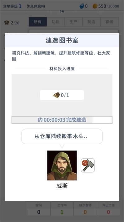 5、在这里找到空闲人员后,系统会自动进行建筑修建;请注意,修建建筑需要材料,务必保持材料充足。