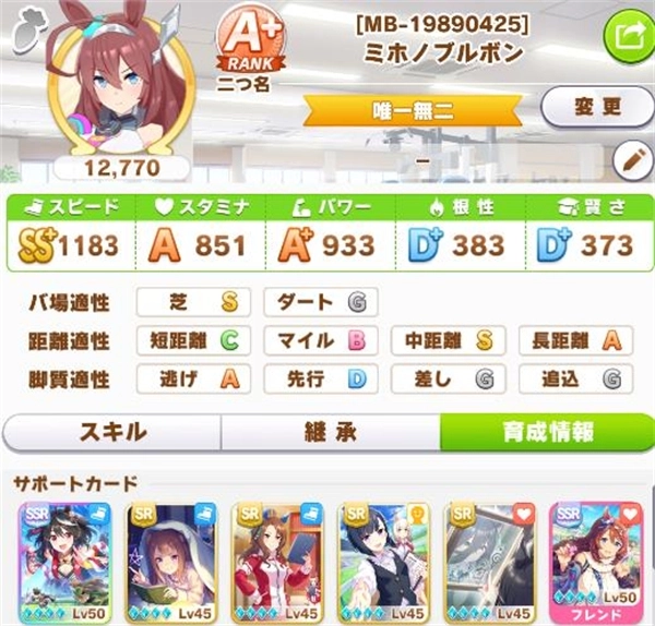 3、接下来是普通组,这类马娘的育成难度处于中等水平,只要速度和力量这两项属性达到标准,就能在URA赛事中占据优势。种马建议优先选择能提升速度的;跑法方面,领头或前列是比较合适的选择,而伏特加、草上飞、胜利奖券这几匹可以考虑采用居中跑法。配卡搭配上,推荐3张速度卡加2张力量卡,借卡的位置可以留给绿帽卡或者速度卡。育成前期同样以提升羁绊为主,等羁绊达到橙色等级后,就把重点放在速度属性的培养上,同时力量属性也需要适当兼顾,最终通关URA的目标属性建议设定为速度800、力量600。
