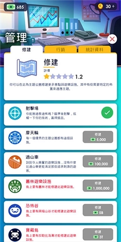 4、当资金充足时,点击管理界面中的“修建”选项,就能增加更多的游乐设施。