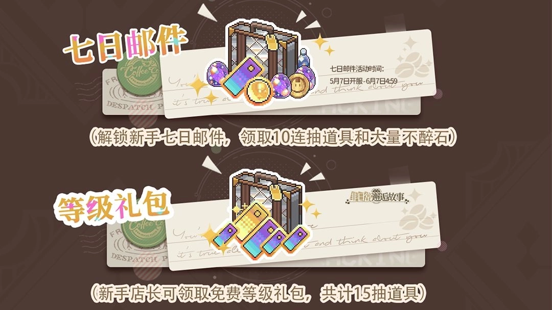 【七日登录邮件与免费等级礼包】完成新手引导、提升等级,并连续登录七日,可获得约35次抽奖机会与400个不醉石。