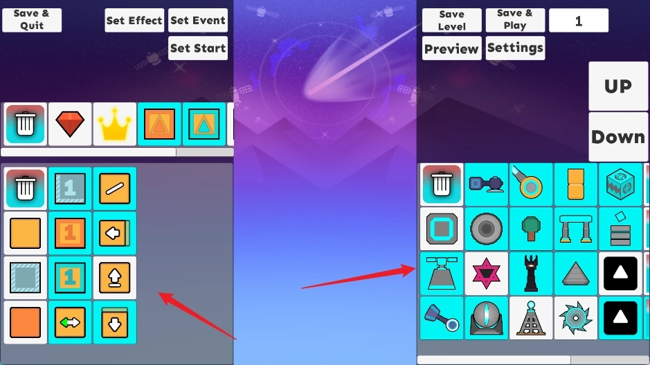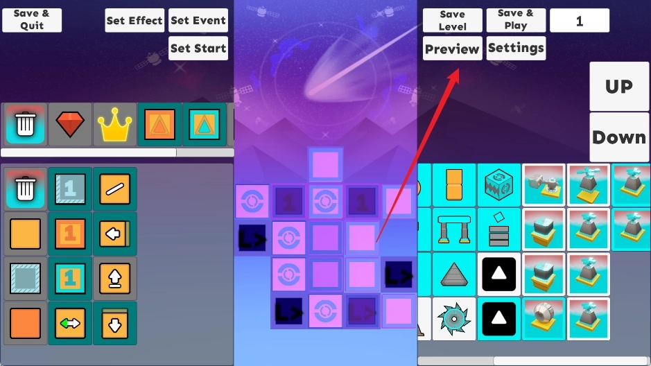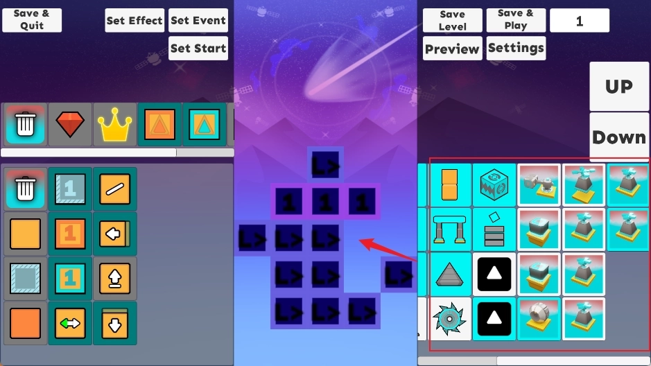 6、保存好的关卡会显示在主菜单的关卡列表里,你可以随时点击进入试玩模式。亲自感受通关的难易程度,或者分享给好友让他们挑战你的设计极限,真正达成“玩自己设计的关卡,也玩别人设计的关卡”的创意闭环!