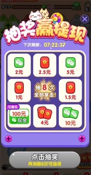 3、游戏中红包奖励丰厚,玩家在消除一定次数后可以进入转盘抽奖,有机会获得额外奖励,如金币、道具等。