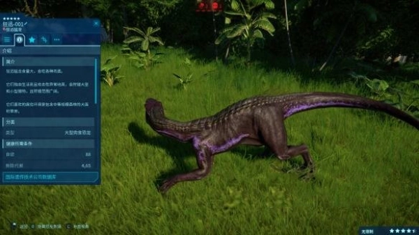 这种基因改造混种生物源自《侏罗纪世界2》,它有着流线型的外形,同时具备出色的速度与强大的力量,是专门为战斗而设计的生物武器。在游戏里,它是唯一拥有特殊击杀动画的单位,不过其饲养条件颇为严苛,而且需要较大的围栏空间。