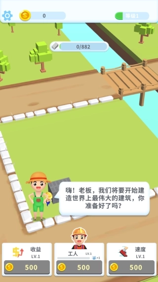 1、刚开始的时候,我们首先要做的就是购买一个工人来准备搬砖,花费500金币就能增加一名工人。