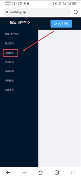 2、在浏览器中打开兔宝用户中心页面后,点击开启导航栏
