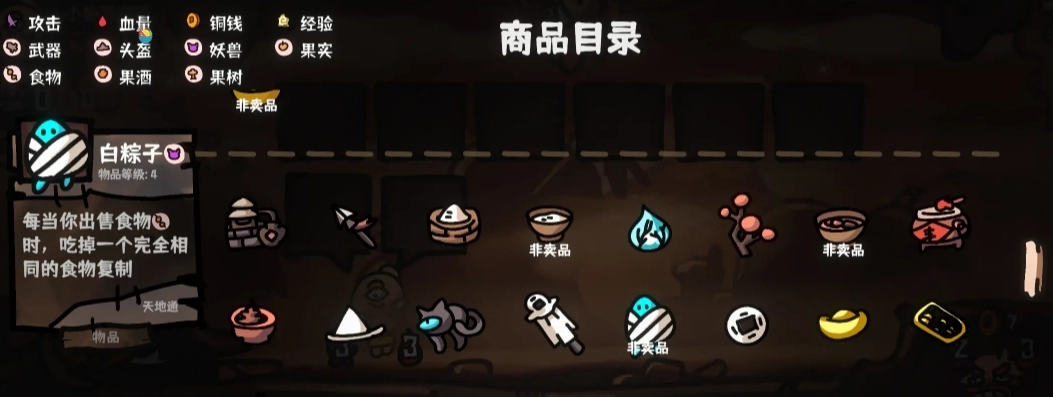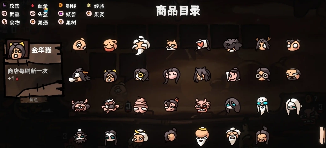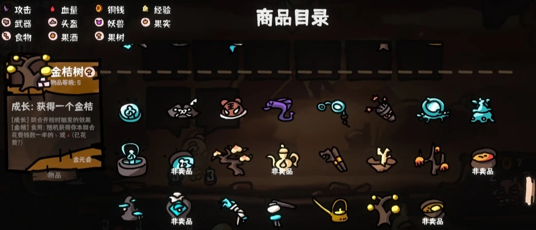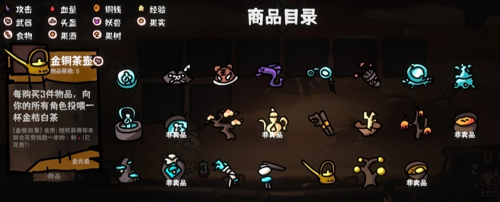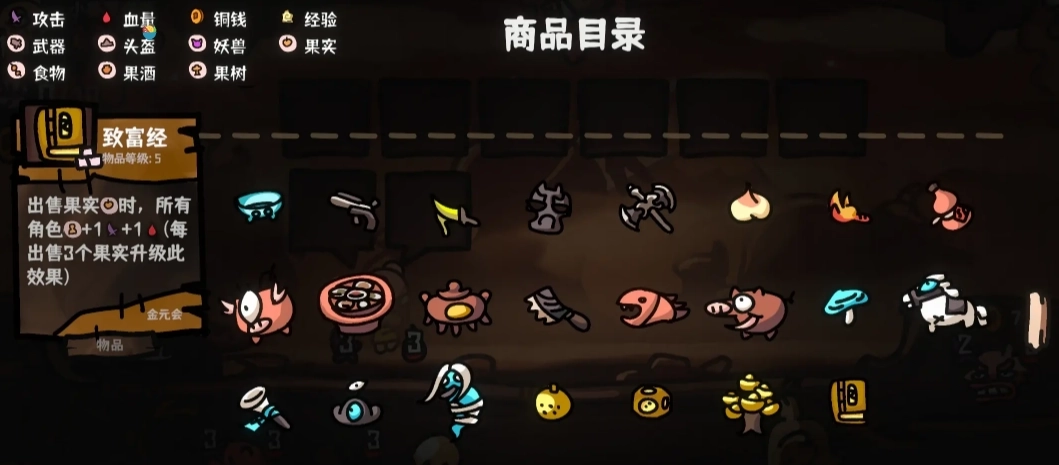 5、阵容成型后,每回合就是把种出来的水果一卖,就可以收获大量属性。道具栏需要留两个空格装水果,所以不能填满。不用[庆功宴]的原因是[致富经]随着水果的出售,加的属性会变多。如果实在刷不出来,[庆功宴]勉强能用。