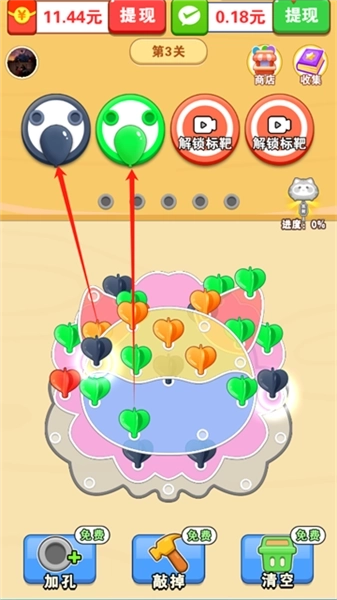 1、点击飞镖去击打颜色相同的气球,当打掉三个气球后,就能刷新出三个新的气球。