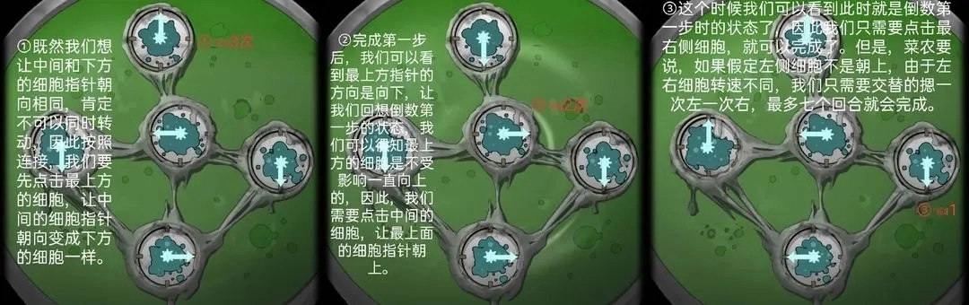 诊断室里的显微镜谜题有着独特的机制:各个细胞之间通过线条相互连接,这意味着当转动其中一个细胞的指针时,和它相连的细胞也会一起同步旋转。需要特别留意的是,右侧的细胞每点击一次就会完成半圈的旋转(点击两下就是一整圈),而剩下的四个细胞则需要点击四次才能完成一整圈的旋转。所以,解开这个谜题的关键在于,最后一步操作必须在右侧的细胞上进行。通过逆向推导最终想要达成的状态,我们能够得出倒数第二步时各个细胞指针的方向,具体如下图所示: