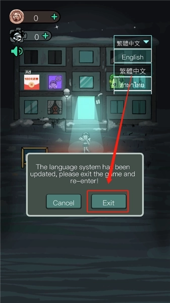 3、切换成功后会出现如下提示,为使语言替换生效,需要重启游戏,点击图示位置可快速关闭游戏。