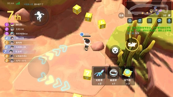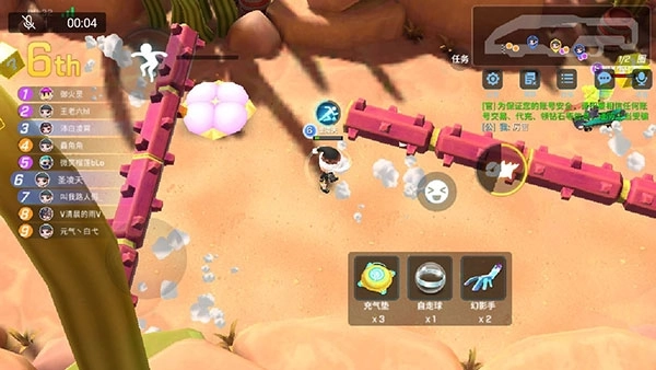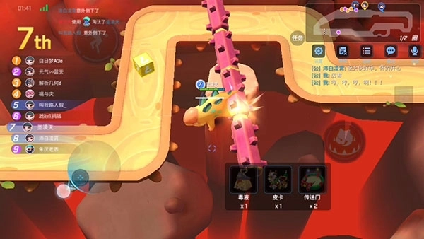 这是个超看脸的路段——指运气方面,说不定你刚攒好皮卡捣弹准备开冲锋反超第一,突然就有恐龙怼脸,说直白点简直能让人血压飙升。传送门、护盾得优先选,跳高、阻挡箱、滑板这些道具都能用来跳开恐龙规避伤害。要是想搭配皮卡、捣弹这类载具推进,和气垫组合起来效果会特别好。要是到了最后一圈,还可以故意卡在第二留个巡航导弹,这样反超起来就轻松多了。