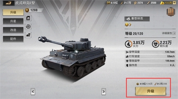 兵卡每提升十级后,若要继续升级,还需额外消耗子弹和经验。以苍狼阵营的重坦为例:当前从10级升到11级,需要1140经验与40子弹;而从20级升到21级时,所需的资源会更多。并且,兵卡升级所需的经验资源会随着等级的提升而增加,20级到21级的消耗就是这种提升的体现。