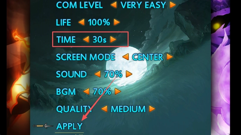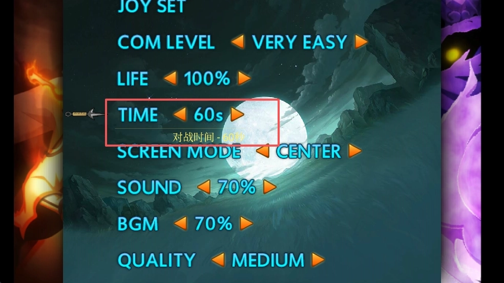 2、进入设置页面后,找到“Time”选项,在这里能够调整每回合的对战时长,默认时长为60秒。