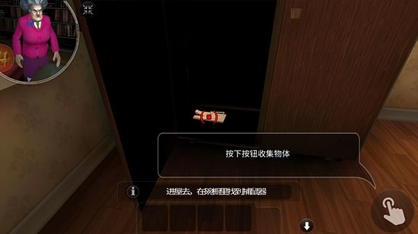 4、当监控画面显示老太太离开房间后,立刻快速靠近房门,把准心对准锁具的位置,点击屏幕就能完成解锁并潜入房间。