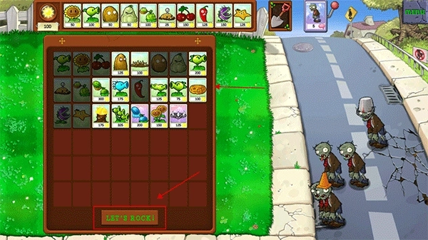 1、游戏开局时要从卡牌栏里挑选出战植物,确定好阵容后点击“letsrock”就能进入战场