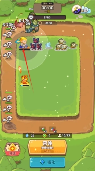 1.召唤英雄上战场备战,与不断袭来的怪物群进行正面对战,一较高下。