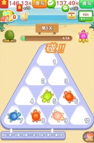 《拆个小乌龟赚钱游戏最新版》是一款人气超高、趣味性十足的休闲合成类手机游戏!在游戏里,只要看到颜色相同的小乌龟就能进行合成,当合成到一定数量后,不仅能解锁关卡,还能赢取丰厚的游戏奖励!玩家可通过拆包获取色彩各异的乌龟,这些乌龟会按特定顺序排列在格子中,满足相应条件就能消除并获得积分,达到指定分数即可通关,而且每次通关都能拿到小红包!这款游戏玩法轻松休闲,奖励更是十分诱人!