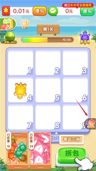 1、每一个关卡都设有不同的积分要求,玩家需要借助拆包获取不同颜色的乌龟,通过消除这些乌龟来达成得分目标。