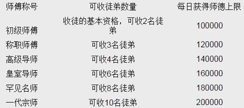 师傅的称号共划分为六个等级,若没有师傅称号,便不拥有收徒的资格。