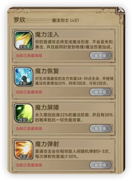 首先我们来看看魔剑士的技能特点,魔剑士的核心优势在于她是游戏中唯一能同时兼顾物理与魔法两种修炼方向的英雄,因此物理加成和魔法加成这两种属性都能有效增强她的输出能力。而魔力弹射这一技能的存在,在魔剑士拥有专属武器的前提下,无论是面对群体敌人还是单个目标,都能为她提供显著的伤害增益。
