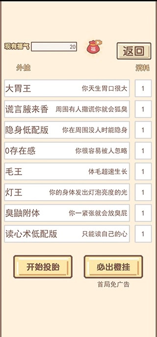 在这里你可以自由选择“天赋”,也就是所谓的外挂,同样选择的数量为3条,接着“开始投胎”。这里小编提供给你一个的小技巧:带上更多外挂投胎可以提升修为,拥有更强的人生!