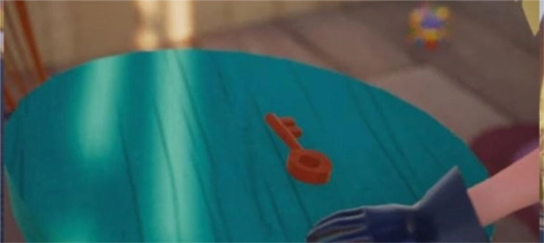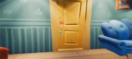 取走蓝色桌面上的钥匙,前往一楼客厅,打开蓝色沙发旁的黄色门,进入地下室。