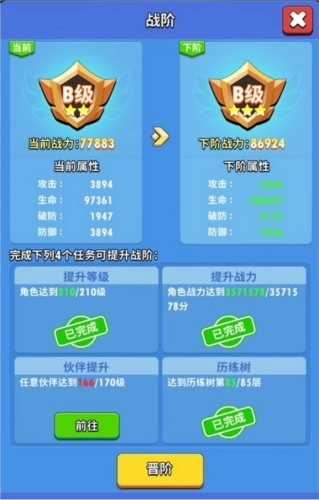 在游戏里,当角色达到特定等级后,通过升级培养角色与伙伴能够提升战力,而挑战历练塔则可以让战阶升级,进而增强角色属性。