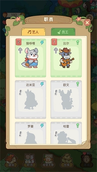 2、也不要忘记雇佣员工哦!这里的员工都由小动物来单人,比如小浣熊、柴犬、布谷鸟等各司其职哦;
