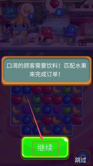 3、接收订单:在24移动次数的界面中,点击继续匹配水果。